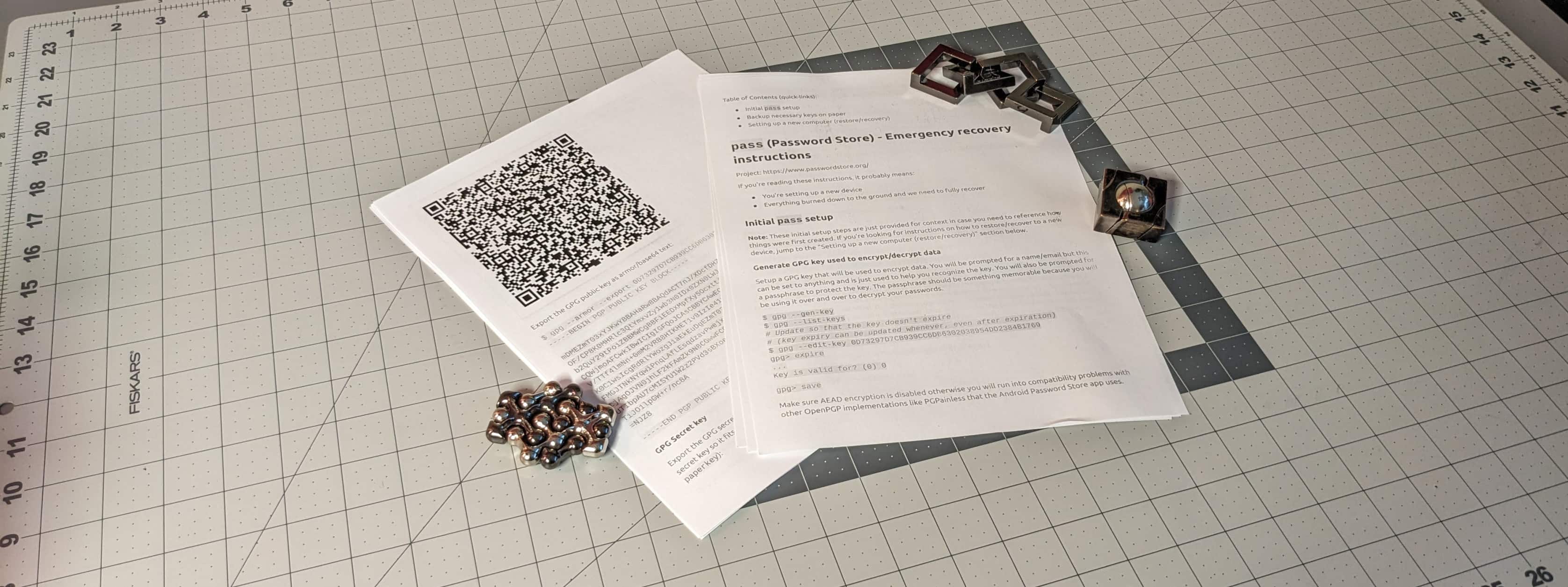 If you're curious to get a preview of how the setup will look and how pass works, this Dreams Of Code video is a great resource. This blog post also goes over the initial setup of pass so that the printed instructions include everything you need to fully bootstrap a new device in case of recovery and so you have a reference on how you initially set everything when you're trying to recall months/years later. The core new piece of information that this blog post goes over is how to backup your SSH and GPG keys to paper and recover from them in case of emergency.